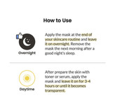 استفاده در شب : ماسک را در پایان روتین و قبل از خواب،روی پوست قرار دهید. ماسک بایودنس را صبح روز بعد پس از روی پوستتان بردارید.